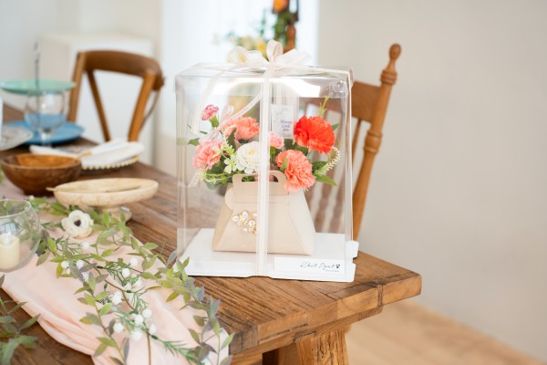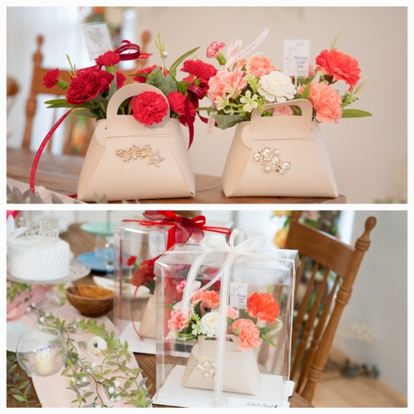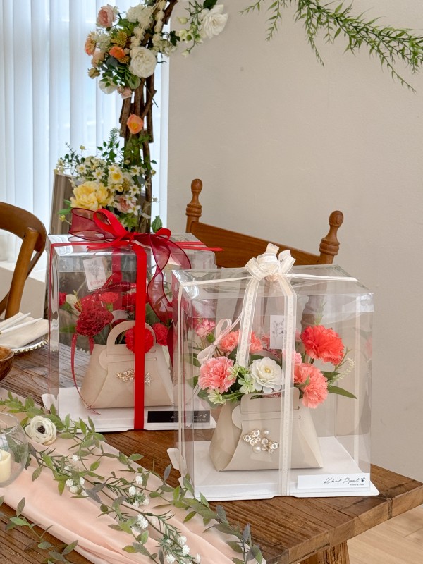 1. 진주로 장식한 고급스러운 미니 가방안에 카네이션 비누꽃으로 디자인한 상품입니다.