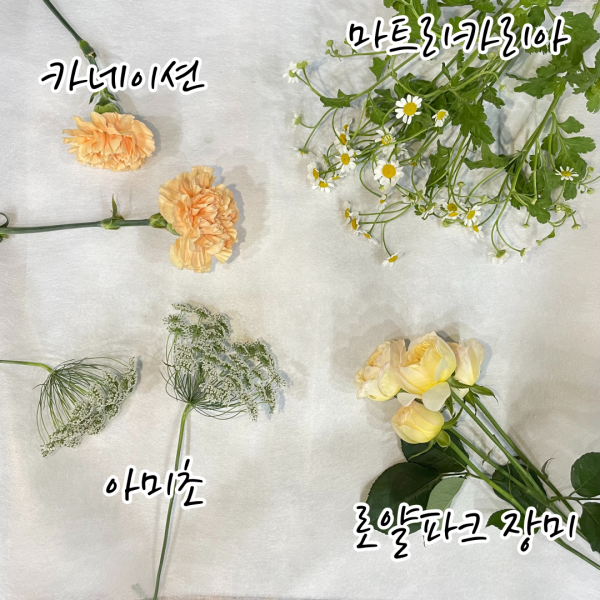 카네이션과 로얄파크 장미, 마트리카리아, 아미초입니다.