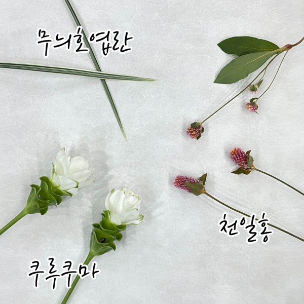 쿠루쿠마와 천일홍, 무늬호엽란입니다.