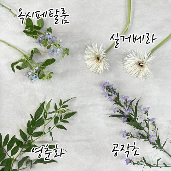 실거베라와 공작초, 옥시페탈룸, 영춘화입니다.