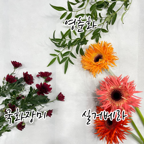 실거베라, 국화장미, 영춘화입니다.